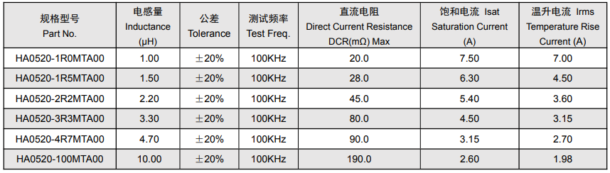 HA0520ϵÁС°³¬´ó±¥ºÍµçÁ÷¡±Îª½¹µã£¬µäÐÍÐͺÅÈç HA0520-1R0MTA00£¬±¥ºÍµçÁ÷£¨Isat£©¿É´ï 7.5A£¬ÎÂÉýµçÁ÷£¨Irms£©7.0A£¬×ÝÈ»ÔÚ´óµçÁ÷¹¤¿öÏ£¬ÈÔÄܱ£³Öµç¸ÐÁ¿Îȶ¨£¬ÖÆÖ¹ÒòµçÁ÷¹ýÔØµ¼ÖµÄÐÔÄÜË¥¼õ¡£Ëæ×ŵç¸ÐÁ¿Ôö¼Ó£¬µçÁ÷³ÐÔØÄÜÁ¦³ÊÏßÐÔÓÅ»¯£¬ÀýÈçµç¸ÐÁ¿ 10¦ÌH µÄHA0520-100MTA00£¬±¥ºÍµçÁ÷Ϊ 2.6A£¬ÎÂÉýµçÁ÷ 1.98A£¬Âú×ã²îÒ칦ÂÊÆ·¼¶µÄÉè¼ÆÐèÇó¡£