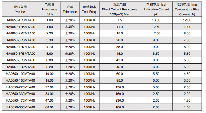 HA0650ϵÁй¦Âʵç¸ÐÌṩ´Ó 1.0¦ÌH ÖÁ 68.0¦ÌH µÄ¸»ºñµç¸ÐÁ¿Ñ¡Ôñ£¨Èç HA0650-1R0MTA00 ÖÁ HA0650-680MTA00£©£¬¹«²î¾ùΪ ¡À20%£¬²âÊÔÆµÂÊͳһΪ 100KHz£¬Âú×ã²îÒìÍØÆË½á¹¹µÄµçÔ´Éè¼ÆÐèÇ󡣯äµç¸ÐÁ¿ÓëµçÁ÷²ÎÊý·ºÆðÏÔÖøµÄÏßÐÔÌØÐÔ£º